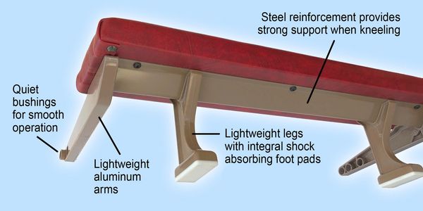 Atwood-Hamlin kneelers stand up to years of use because the support frames are made of heavy gauge metal. Nylon bushings, rubber shock absorbers and integrated rubber foot pads combine to ensure silent operation.